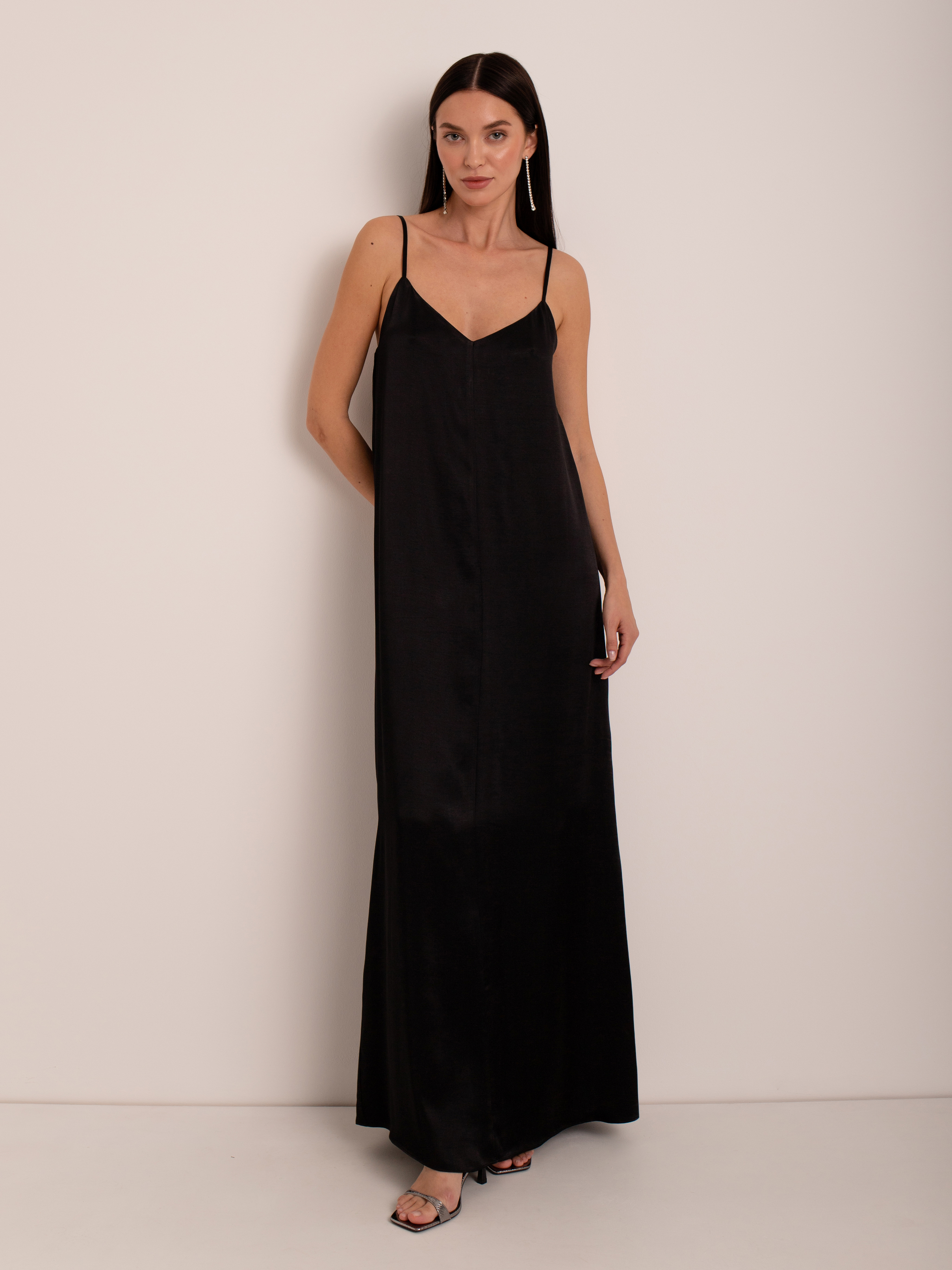 Тонкие бретели подчёркивают линию плеч, а аккуратный V-образный вырез добавляет